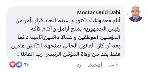 قال وزير الصحة المختار ولد داهي، أنه، وبأمر من الرئيس محمد ولد الشيخ الغزواني، سيتم خلال أيام قليلة اتخاذ قرار "بمنح أرامل و أيتام كافة المؤمنين (موظفين و عمالا دائمين) تأمينا دائما بعد أن كان القانون الحالي يمنحهم التأمين عامين فقط بعد من وفاة المؤمَّن الرئيسي رب العائلة..".