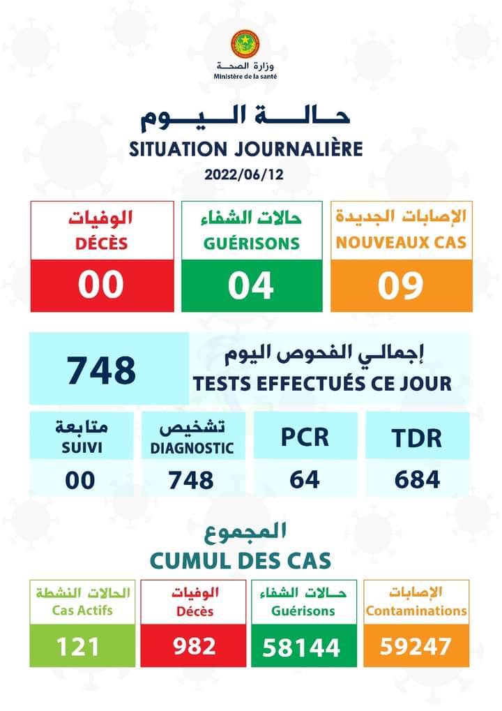 أعلنت وزارة الصحة الموريتانية، مساء اليوم الأحد، تسجيل 9 إصابات جديدة بفيروس كورونا، إضافة إلى 4حالات شفاء، دون تسجيل أي وفاة مرتبطة بابفيروس خلال ال24 ساعة الماضية.
