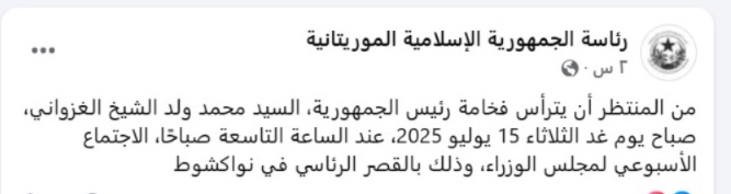 وكشفت الرئاسة الموريتانية عبر صفحتها في فيسبوك عن تقديم الموعد الأسبوعي لمجلس الوزراء إلى الثلاثاء التاسعة صباحا بدل الأربعاء.
