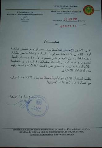 نظرا للتطور الإيجابي الملاحظ بخصوص تراجع انتشار جائحة كوفيد 19 في بلادنا منذ حوالي 10 أسابيع، وانطلاقا من تطابق أوجه الخطر بين التجمع على مستوى الأسواق ووسائل النقل العمومي ونحوها، مع قاعات الحفلات، فإن وزير الداخلية واللامركزية يعلن رفع الحظر عن قاعات الحفلات، والسماح لها بمزاولة نشاطها الإعتيادي.