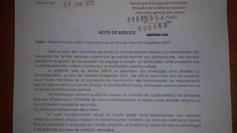 أصدرت قيادة أركان الجيوش بموريتانيا تعميما يهدف لـ"عقلنة" مصادر الجيش بشكل عام، وخاصة المتعلقة بالمحروقات، وتم وفقا لهذه التعميم اعتمدا نظام جديد لتسييرها، وذلك للتعامل مع واقع رفع الدعم عنها.