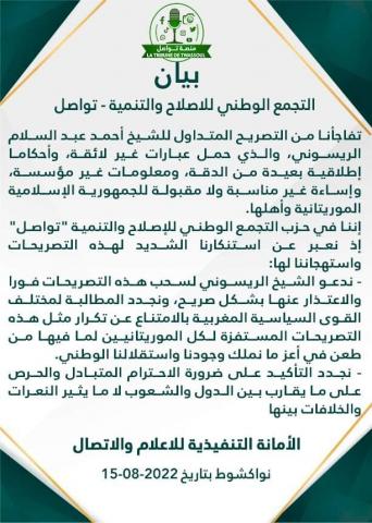 وقال تواصل في بيان له إنه  تفاجأ من التصريح المتداول، مؤكدا أنه حمل عبارات غير لائقة، وأحكاما إطلاقية بعيدة من الدقة، ومعلومات غير مؤسسة، وإساءة غير مناسبة ولا مقبولة للجمهورية الإسلامية الموريتانية وأهلها، داعيا الريسوني إلى سحبه فورا و الاعتذار الصريح عنه.