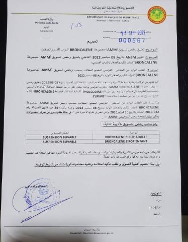 أصدر وزير الصحة المختار ولد داهي تعميما بتعليق رخص تسويق دواء BRONCALENE، وذلك تأسيسا على طلب وارد من المختبر الفرنسي المصنّع.
