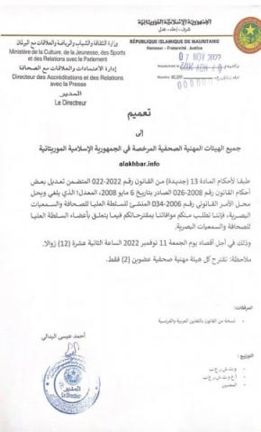 أبلغت السلطة العليا للصحافة والسمعيات البصرية "HAPA" الهيئات الصحفية المرخصة بأن نهاية دوام يوم الجمعة المقبل يعتبر آخر أجل لاستقبال مقترحاتها لعضوية السلطة، وذلك وفقا للقانون الجديد الذي صادق عليه البرلمان في دورته الأخيرة.