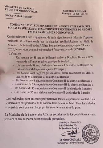 أعلنت وزارة الصحة بمالي عن ارتفاع عدد الإصابات بفيروس كورونا المستجد إلى 11 إصابة بعد تسجيل 7 إصابات جديدة خلال 48 و تعود 4 على الأقل من الإصابات الجديدة لمواطنين مقيمين وهو ما يخشى أن يحول الوباء إلى حالة مجتمعية.