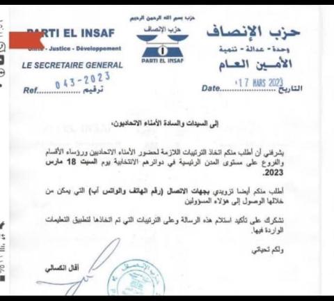 طالب الأمين العام لحزب الإنصاف فال انكسالي رؤساء الأقسام و الفروع بالمدن الرئيسية للتواجد بدوائرهم مساء غد السبت.