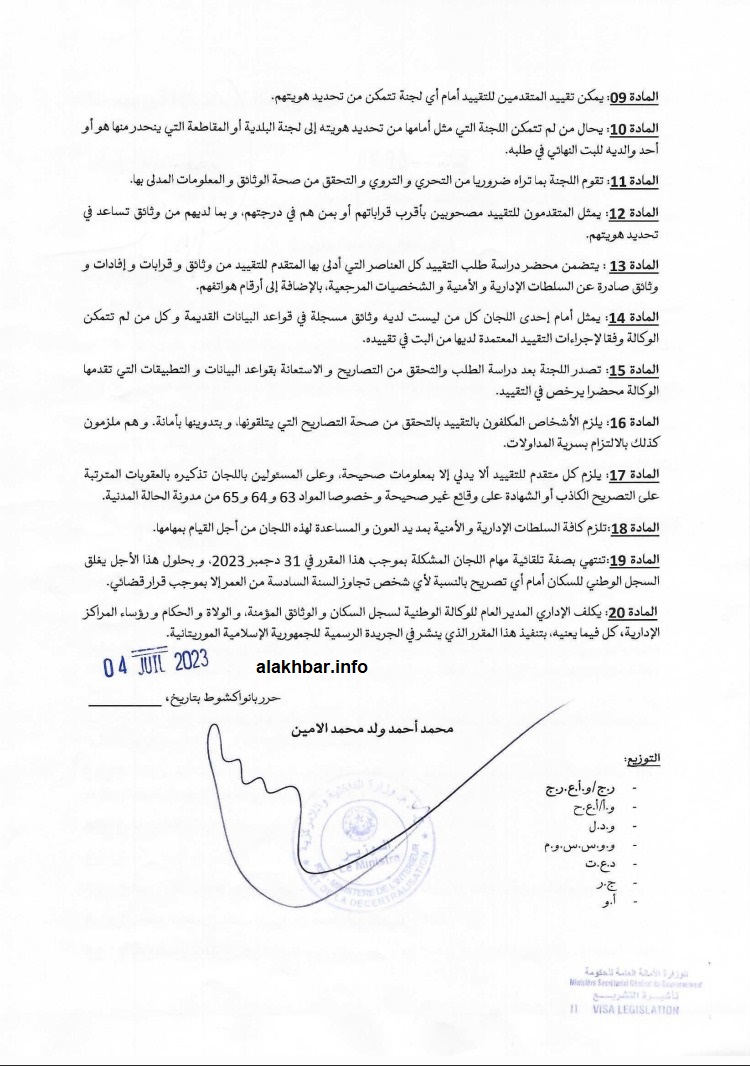 وقع وزير الداخلية واللا مركزية محمد أحمد ولد محمد الأمين يوم الثلاثاء الماضي مقررا يقضي بإغلاق السجل الوطني للسكان يوم 31 ديسمبر المقبل أمام أي تصريح بالنسبة لأي شخص تجاوز السنة السادسة من العمر إلا بموجب قرار قضائي.