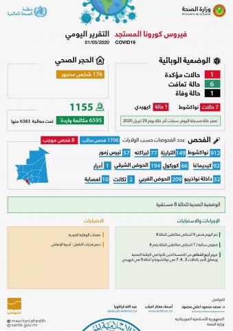 أعلنت وزارة الصحة الموريتانية تسريح اربعة من المصابين بفيروس كورونا المستجد بعد أسبوعين من إعلان شفائهم التام وخضوعهم للحجر الافتراضي ويتعلق الامر بحالة أحد ركاب رحلة 16 مارس وزوجته إضافة إلى الحالة المكتشفة في كيهيدي و الطالبة صاحبة الحالة السابعة.