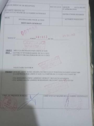 وقع قائد أركان الحرس الوطني الفريق محمد الشيخ ولد محمد الامين الملقب "ابرور"، قرارا بإحالة مجموعة من ضباط القطاع إلى التقاعد، من بينهم المدير العام للأمن الوطني الفريق مسقارو سيدي اقويزي.