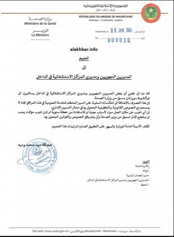 أبلغ وزير الصحة الدكتور عبد الله وديه المديرين الجهويين ومديري المراكز الاستشفائية في الداخل أن أي "تغيب عن مكان العمل سواء لأسباب مهنية أو للاستفادة من عطلة سنوية أو إذن تغيب مؤقت يجب أن يخضع لإذن مسبق من وزير الصحة".