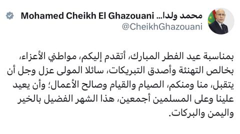 - هنأ الرئيس الموريتاني محمد ولد الغزواني المواطنين بعيد الفطر عبر تغريدة نشرها على حسابه بموقع "اكس"، "تويتر" سابقا.