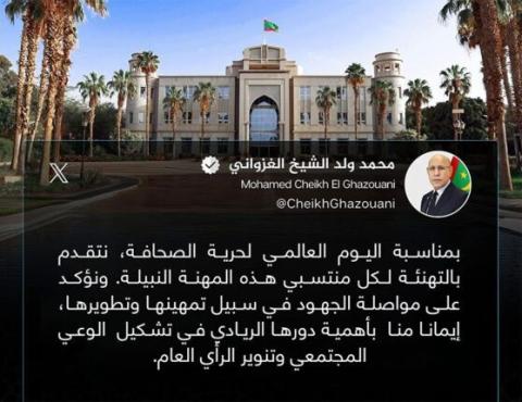 وأكد ولد الغزواني في تغريدة نشرها على منصة "اكس" التزامه بمواصلة الجهود الرامية إلى تطوير مهنة الصحافة وتمهينها، مشيرا إلى الأهمية التي توليها الدولة لهذا القطاع.