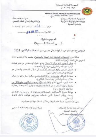 أصدرت وزارتا الداخلية والتربية في موريتانيا بيانا مشتركا موجها إلى كافة الولاة، يقضي بمنع التجمهر أمام مراكز امتحانات الباكالوريا 2025، وفرض عقوبات على استخدام الهواتف داخل قاعات الامتحان.
