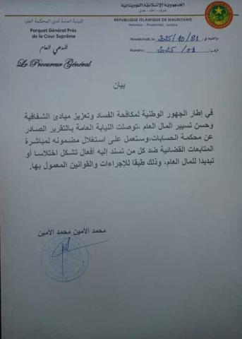 وأوضح البيان الذي وقعه المدعي العام محمد الأمين محمد الأمين أن هذه الخطوة تأتي في إطار الجهود الوطنية لمكافحة الفساد وتعزيز مبادئ الشفافية وحسن تسيير المال العام مشددا على أن النيابة ستتخذ الإجراءات اللازمة طبقا للقوانين المعمول بها.