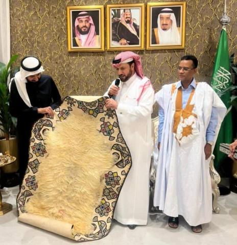 وخلال حفل مأدبة العشاء، قدم سعادة السفير السعودي الدكتور عبد العزيز بن عبدالله الرقابي، لمعالي وزير الحج والعمرة السعودي، هدايا من الصناعة التقليدية الموريتانية تضمنت بساطا جلديا تقليديا وسيفا فاخران.