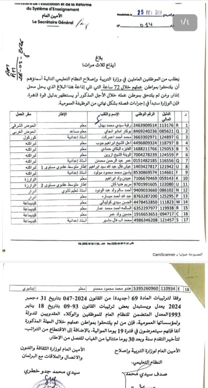 ووقع البلاغ كل من الأمين العام لوزارة التربية وإصلاح النظام التعليمي صدف سيدي محمد، والأمين العام لوزارة الثقافة والفنون والاتصال والعلاقات مع البرلمان سيدي محمد جدو خطري.