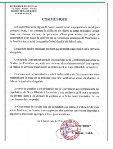 يُحيط والي جهة سانت لويس المواطنين علمًا بأنه خلال الأيام الماضية تم تداول مقاطع فيديو ورسائل صوتية عبر شبكات التواصل الاجتماعي، تتضمن احتجاجات ضد مشروع إنشاء نقطة مراقبة حدودية من طرف الجمهورية الإسلامية الموريتانية، بالقرب من حي غوكسو مباتي المحاذي للحدود.