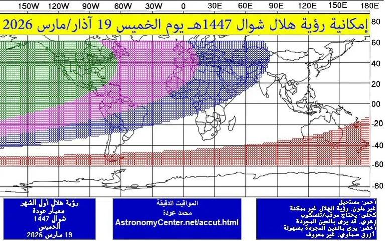 كما وضح التقرير أن الخارطتان المرفقتان تظهران مدى إمكانية رؤية هلال شهر شوال يوم الأربعاء 18 مارس ويوم الخميس 19 مارس من جميع مناطق العالم، بحيث إن: