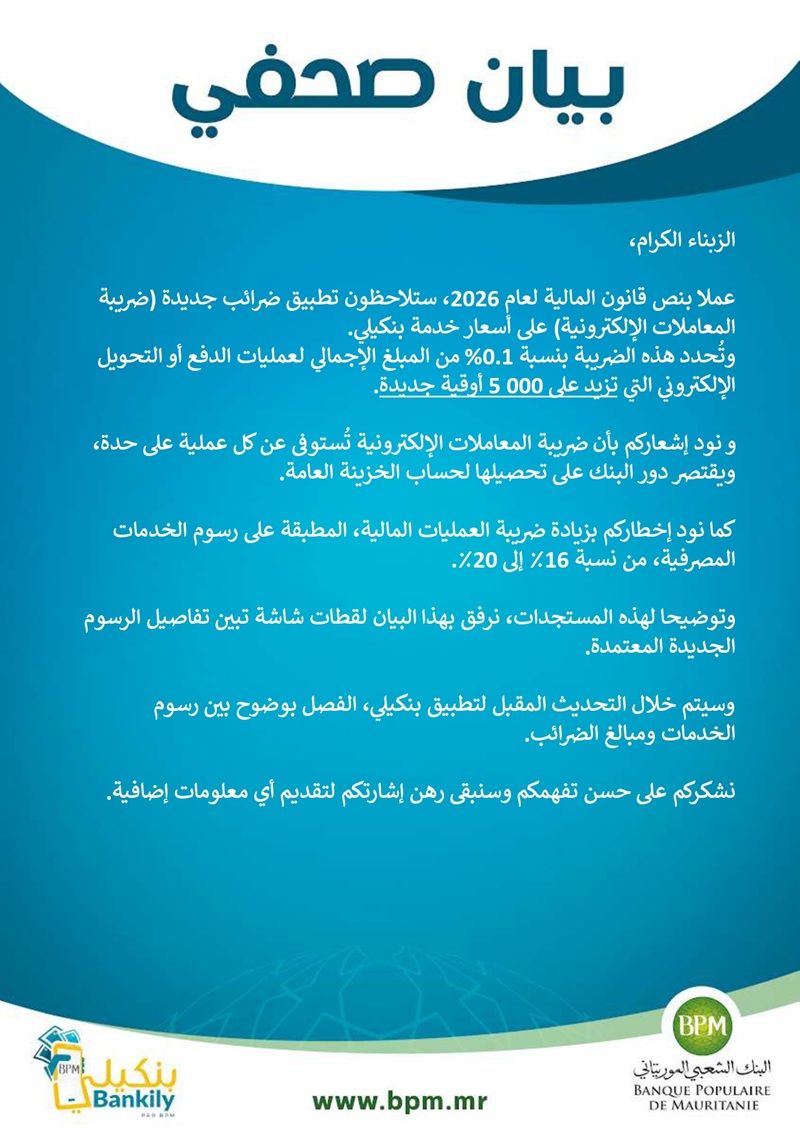 أعلن البنك الشعبي الموريتاني عن تطبيق رسوم وضريبة جديدة على بعض المعاملات الإلكترونية عبر خدمة “بنكيلي”، وذلك ابتداء من عام 2026، استنادا إلى مقتضيات قانون المالية الجديد.