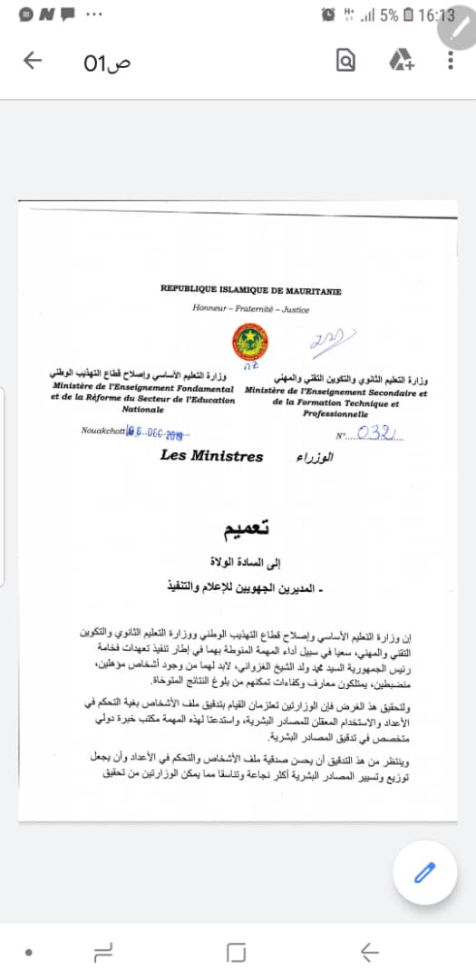 جاء الإعلان عن عملية التدقيق المرتقبة في تعميم موجه للولاة والمديرين الجهويين للتعليم وقعه كل من آدما بوكار سوكو وزير التعليم الأساسي ومحمد ماء العينين أييه وزير التعليم الثانوي.