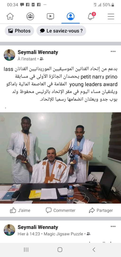 استقبل رئيس اتحاد الفنانين الموسيقيين بموريتانيا محفوظ ولد بوب اليوم 30-12-2020 في مكتبه فنانين موريتانيين فازا قبل أيام بجائزة young leaders awards الإقليمية المنظمة في العاصمة المالية باماكو ويتعلق الامر بكل من lass pruno و petit narr وقد أعلن المعنيان انضمامها للاتحاد معبرين عن امتنانهما لما لقيا من دعم منه خلال رحلة التتويج.