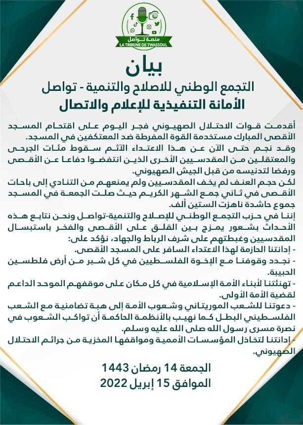 دعا حزب التجمع الوطني للإصلاح و التنمية "تزاصل" الأمة الإسلامية إلى هبة شعبية نصرة للأقصى و المقدسات.