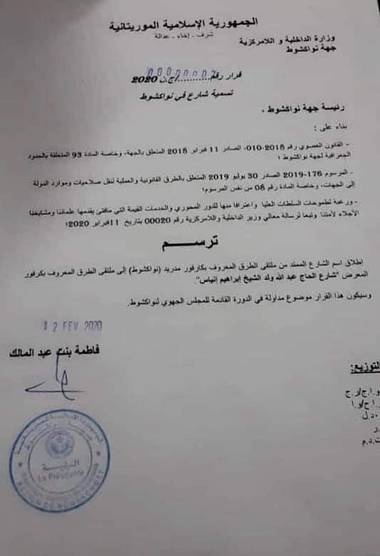 أصدرت رئيسة جهة نواكشوط السيدة فاطمة بنت عبد المالك أمس 12\02\2020 قرار بتسمية الشارع الممتد من ملتقى الطرق المعروف بكرفور مدريد إلى ملتقى الطرق المعروف بكرفور المعرض "شارع الحاج عبد الله ولد الشيخ ابراهيم نياس"
