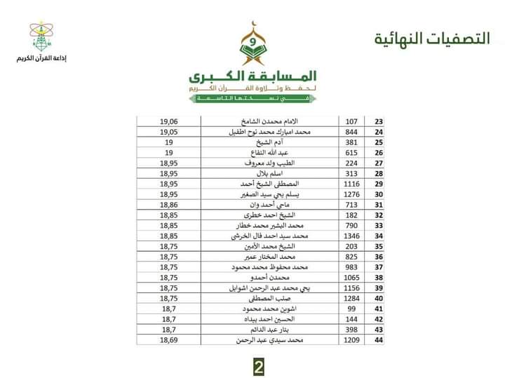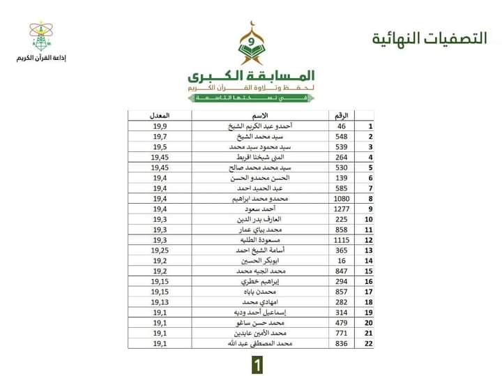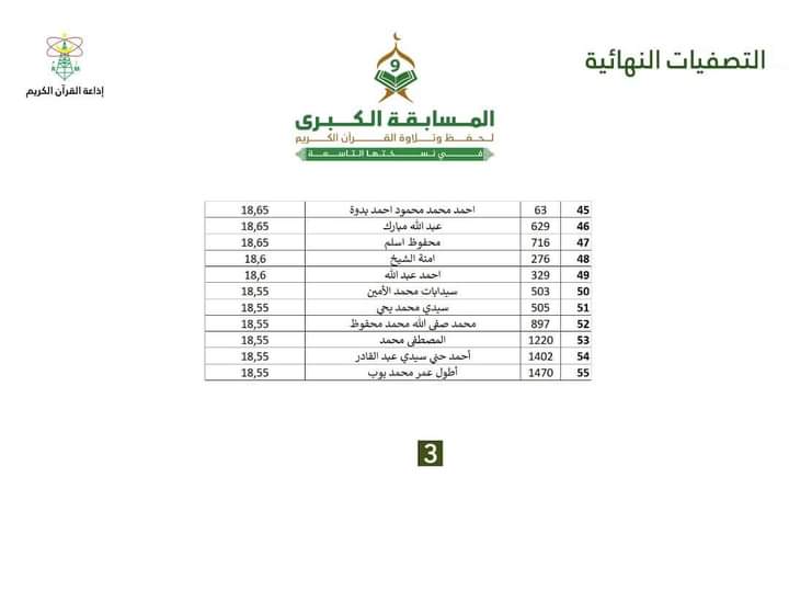 أعلنت اللجنة العلمية المشرفة على المسابقة الكبرى لحفظ وتلاوة القرآن الكريم التي نظمتها إذاعة الموريتانية ، عن "اللائخة الذهبية" ل 63 فائزا في المسابقة.