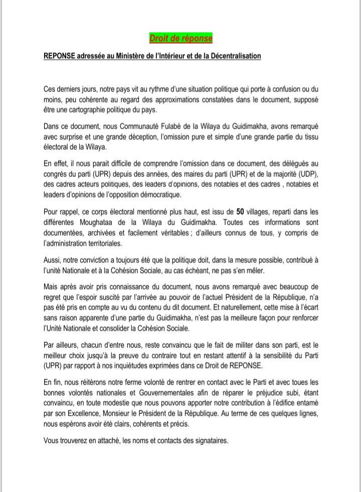 لكن بعد قراءة الوثيقة ، لاحظنا بأسف شديد أن الأمل الذي تولد بعد وصول رئيس الجمهورية الحالي إلى السلطة لم يؤخذ في الاعتبار في ضوء محتوى الوثيقة المذكورة. وبطبيعة الحال ، فإن هذا التهميش الذي حدث دون سبب واضح لجزء مهم من ولاية كيدي ماغا ، ليس أفضل طريقة لتعزيز الوحدة الوطنية وترسيخ التماسك الاجتماعي.