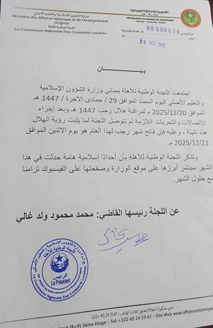 أعلنت اللجنة الوطنية للأهلة أن الإثنين الموافق لـ22 دجمبر 2025 هو فاتح شهر رجب من العام الهجري 14