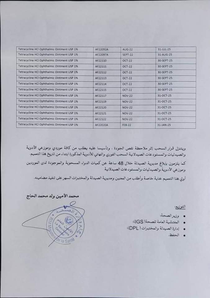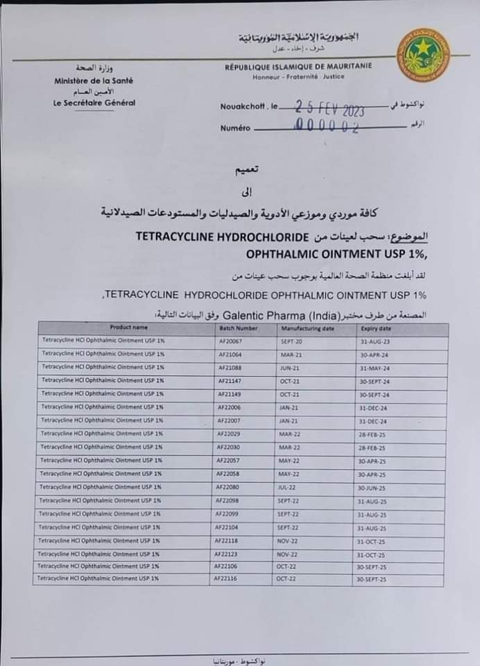 دعت وزارة الصحة إلى سحب لعينات من TETRACYCLINE HYDROCHLORIDE OPHTHALMIC OINTMENT USP 1% إثر ملاحظة نقص في جوجتها.