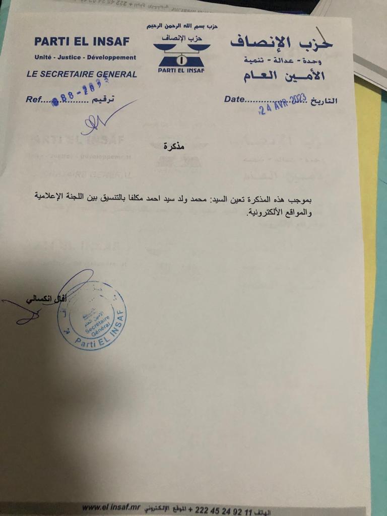 أصدر الأمين العام لحزب الإنصاف افال انكسالي، أمس، مذكرة تعيين الأخ و الإطار محمدو ولد سيد احمد، مكلفا بالتنسيق بين اللجنة الإعلامية و المواقع الإلكترونية.