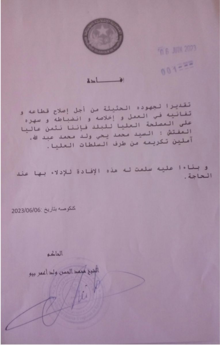 كنكوصه : إشادة رسمية بجهود مفتش المقاطعة للتعليم الأساسي توصية بتكريمه