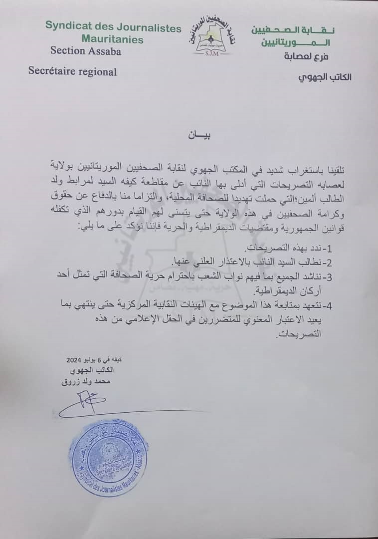 تلقينا باستغراب شديد في المكتب الجهوي لنقابة الصحفيين الموريتانيين بولاية لعصابه التصريحات التي أدلى بها النائب عن مقاطعة كيفه السيد لمرابط ولد الطالب ألمين؛التي حملت تهديدا للصحافة المحلية، والتزاما منا بالدفاع عن حقوق وكرامة الصحفيين في هذه الولاية حتى يتسنى لهم القيام بدورهم الذي تكفله قوانين الجمهورية ومقتضيات الديمقراطية والحرية فإننا نؤكد على ما يلي: