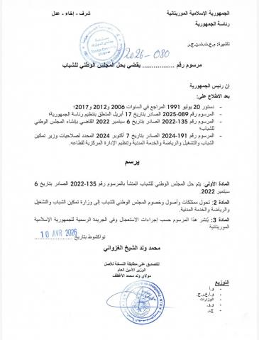 أصدرت الرئاسة الموريتانية وثيقة في العاشر من أبريل الجاري تتضمن مرسوما رئاسيا يقضي بحل المجلس الوطني للشباب .