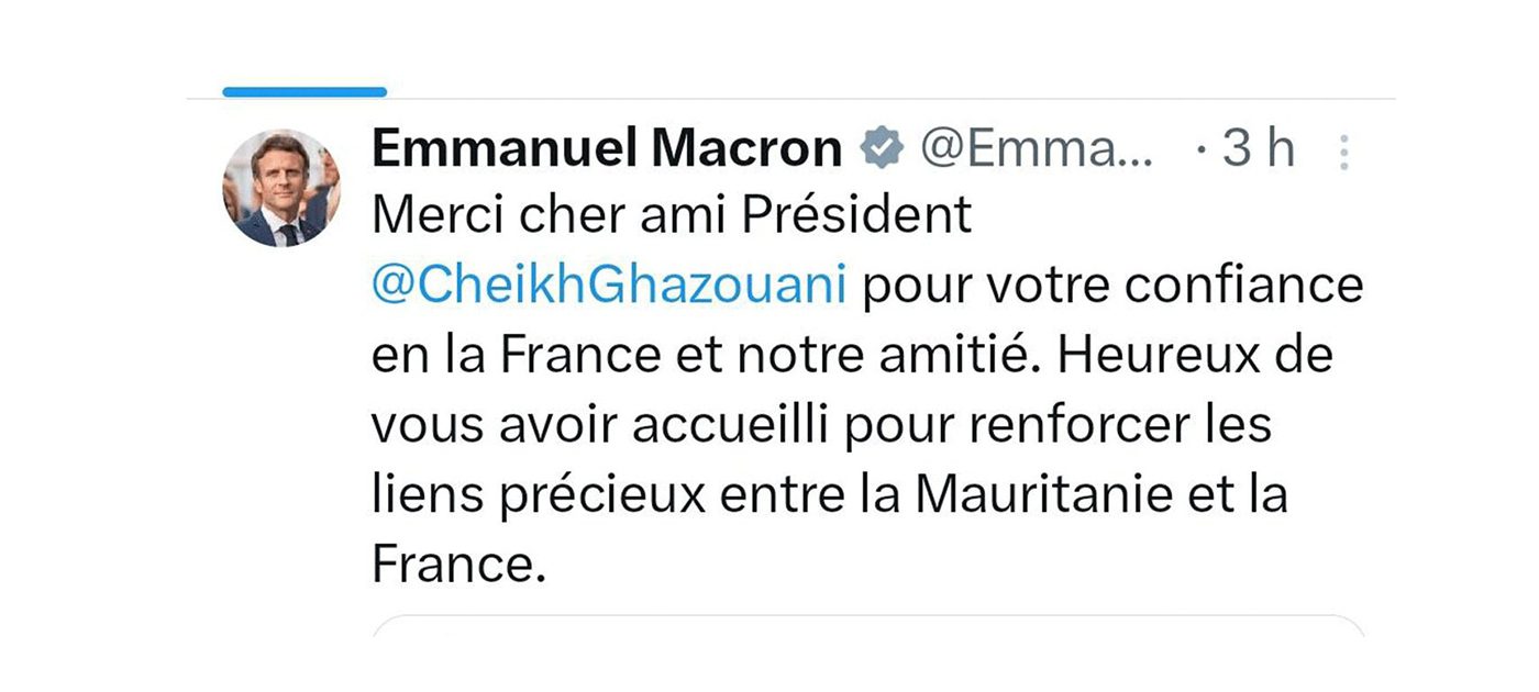 “شكراً صديقي العزيز الرئيس محمد ولد الشيخ الغزواني على ثقتكم في فرنسا وعلى صداقتنا.